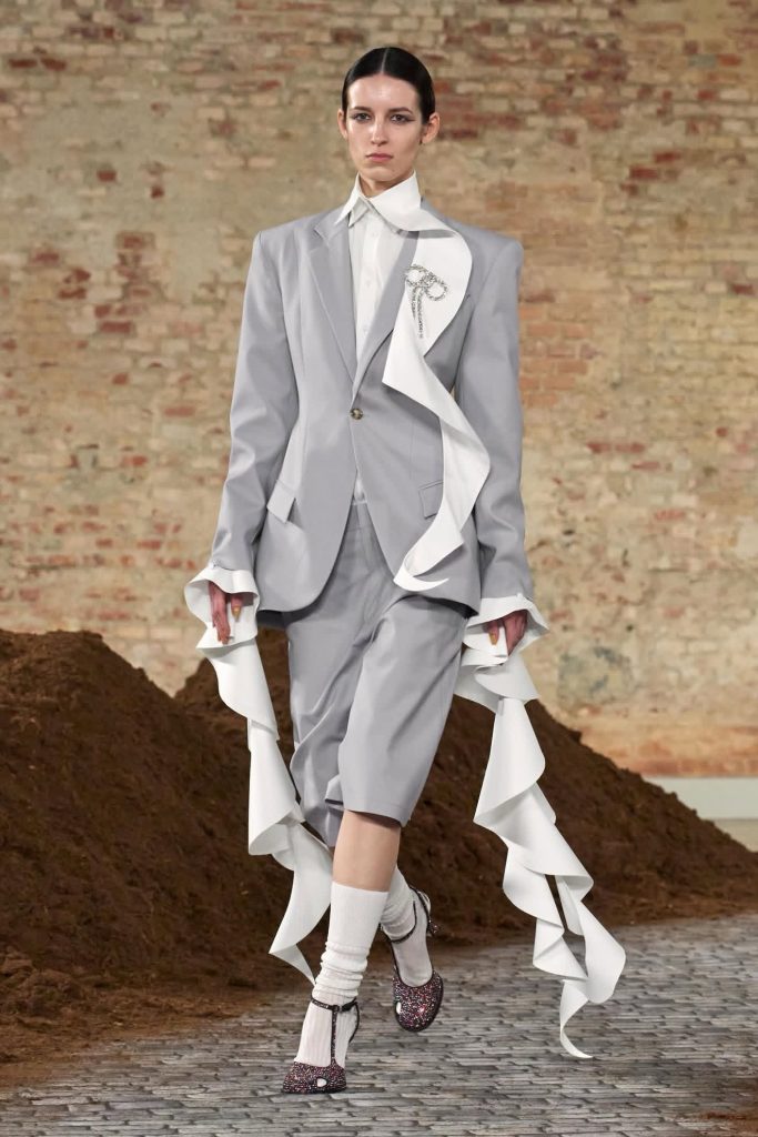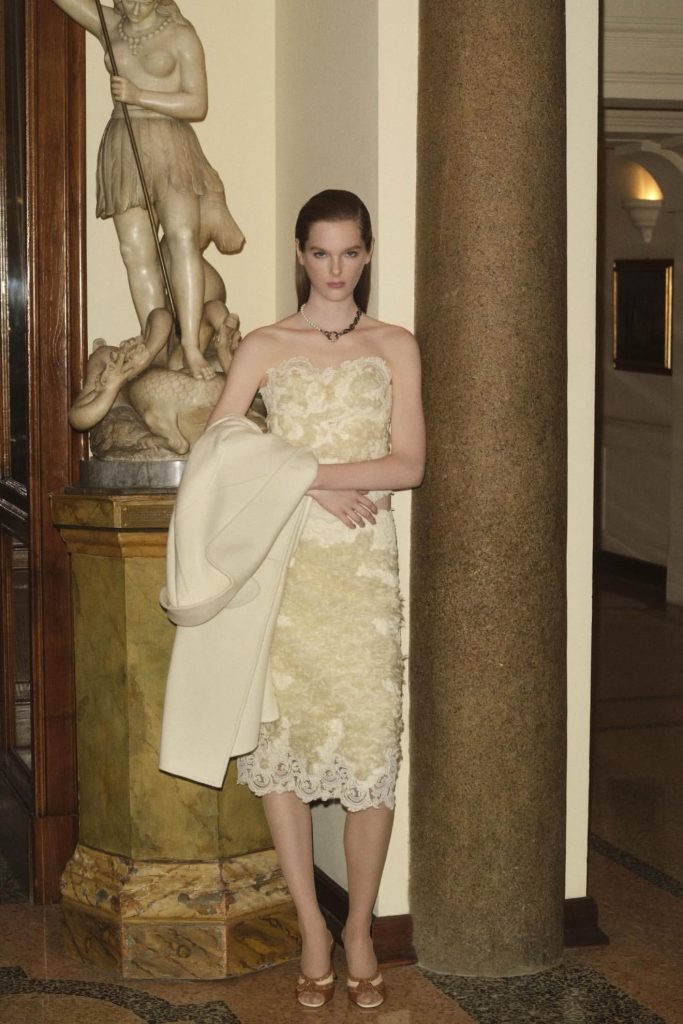 Representing the “something new,” she wore gorgeous Louis Vuitton silk crepe column dress ‘look 27’ from the spring/summer 2026. The pristine white gown featured a dramatic black bow that cascaded into a train, perfectly embodying the “drama” of the film’s title.