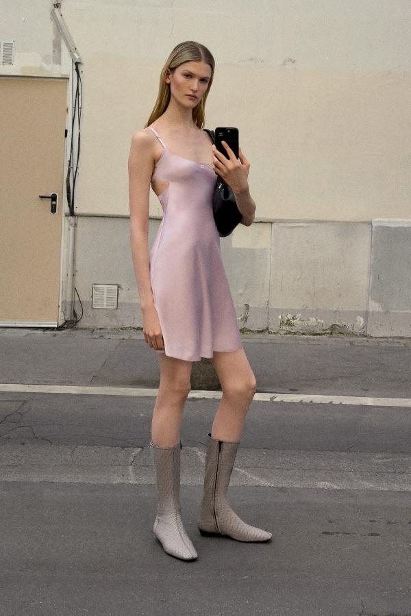 The men’s collection mirrors the women’s in its exploration of gender-fluid fashion, featuring clean lines and hybrid street wear. Notable pieces include boxy polos were paired with curved baggy jeans, cropped to highlight sock boots. His signature flared pants were complemented by a classic white T-shirt, enhanced with cap sleeves that paid homage to an archival trapeze dress, which reflects a generation that is self-documented and style-savvy.