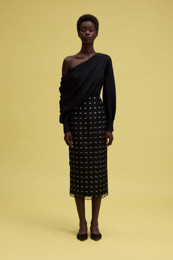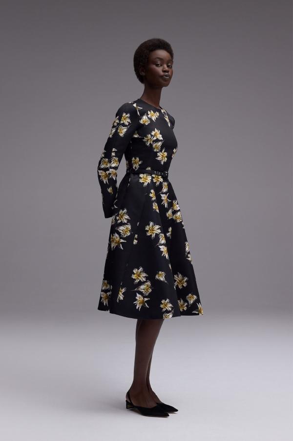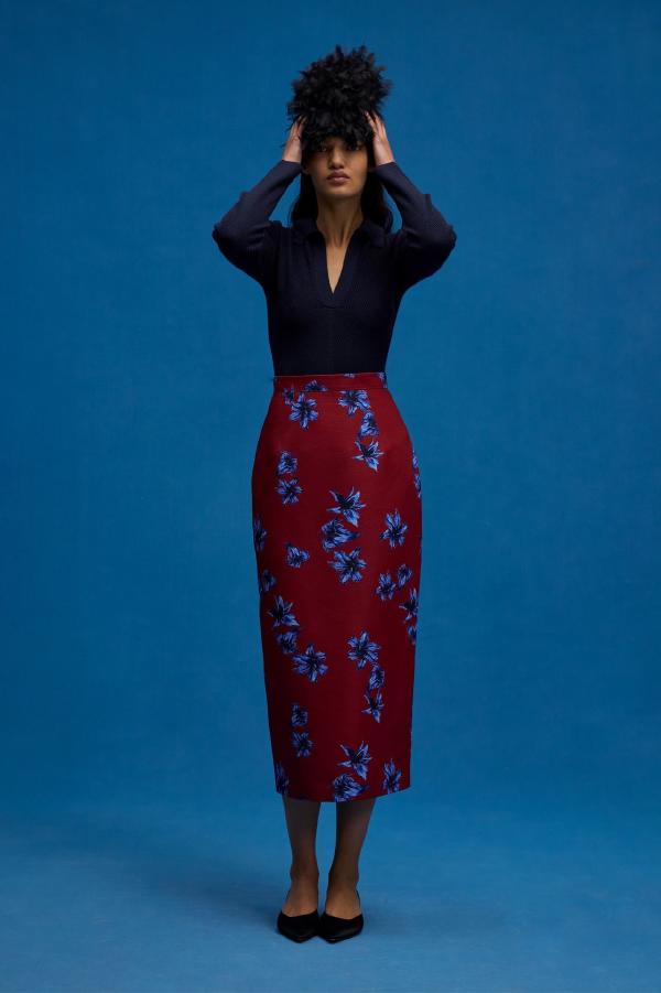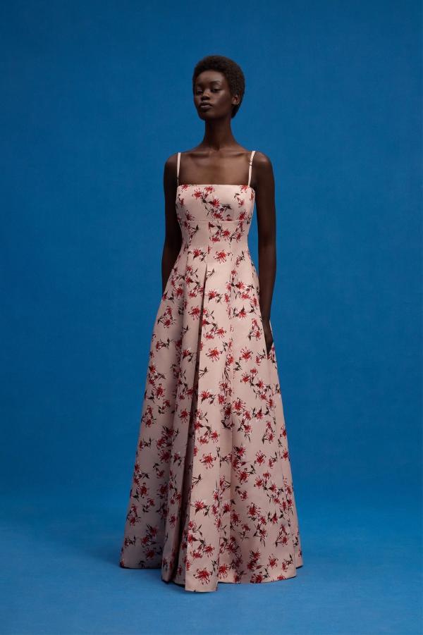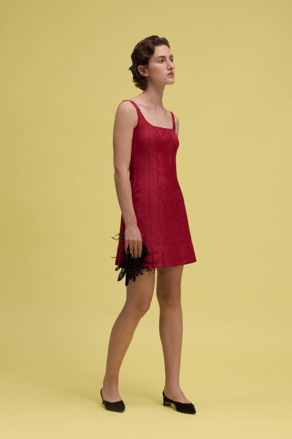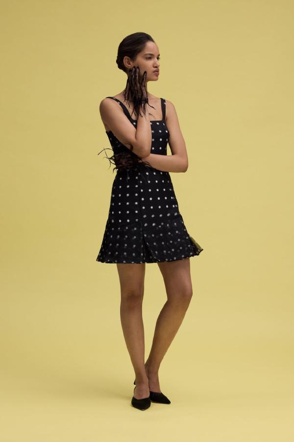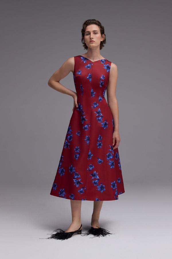 The collection features an assortment of dresses and skirts, including sleeveless fit-and-flare styles paired with pencil skirts, providing a range of choices for both formal and semi-formal events. Some pieces are embellished with scattered floral patterns, while others showcase vibrant, saturated shades of red, pink, and yellow. A standout item is a polka dot dress with a sheer organza overlay, crafted to evoke a sense of optical distortion and fluidity.