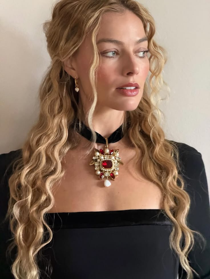The details are what truly bring this look to life. During the London premiere, Margot wore a replica of a “mourning bracelet” made from braided hair, a traditional Victorian practice. While you don’t have to go that far, “heirloom” style jewelry is a major trend.