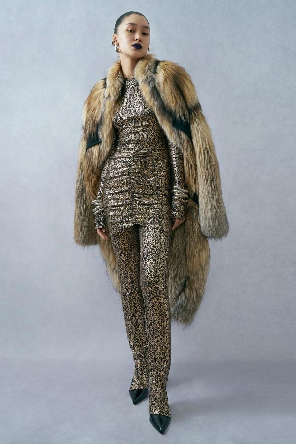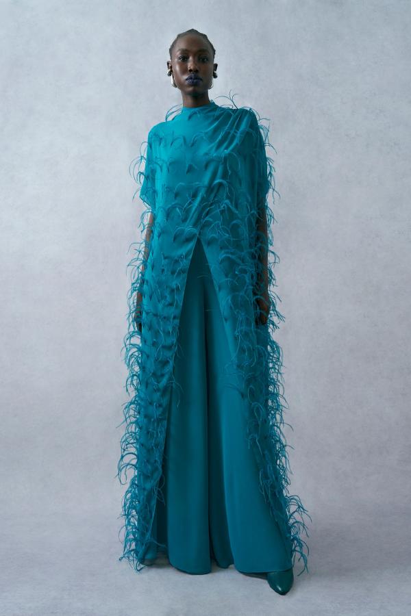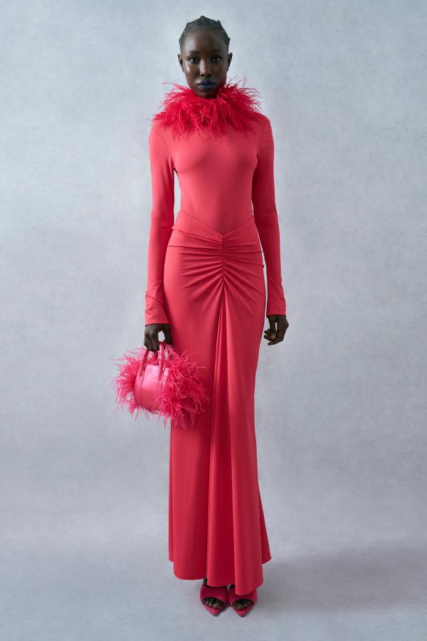 New designs, such as a feather-trimmed shift dress, introduce playful yet polished elements, a notable increase in evening wear options, crafted from high-quality jersey that contours the body for a relaxed yet glamorous look, catering to a sophisticated audience.