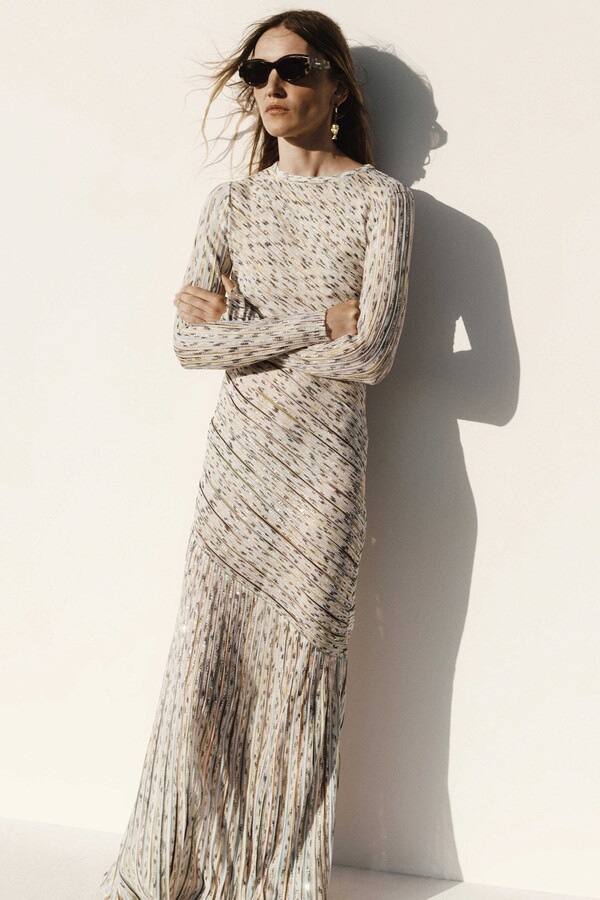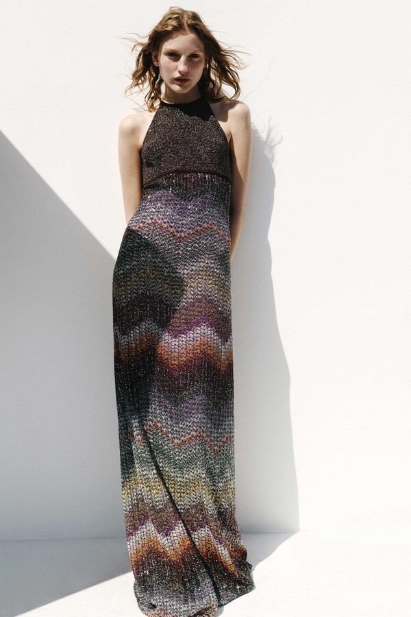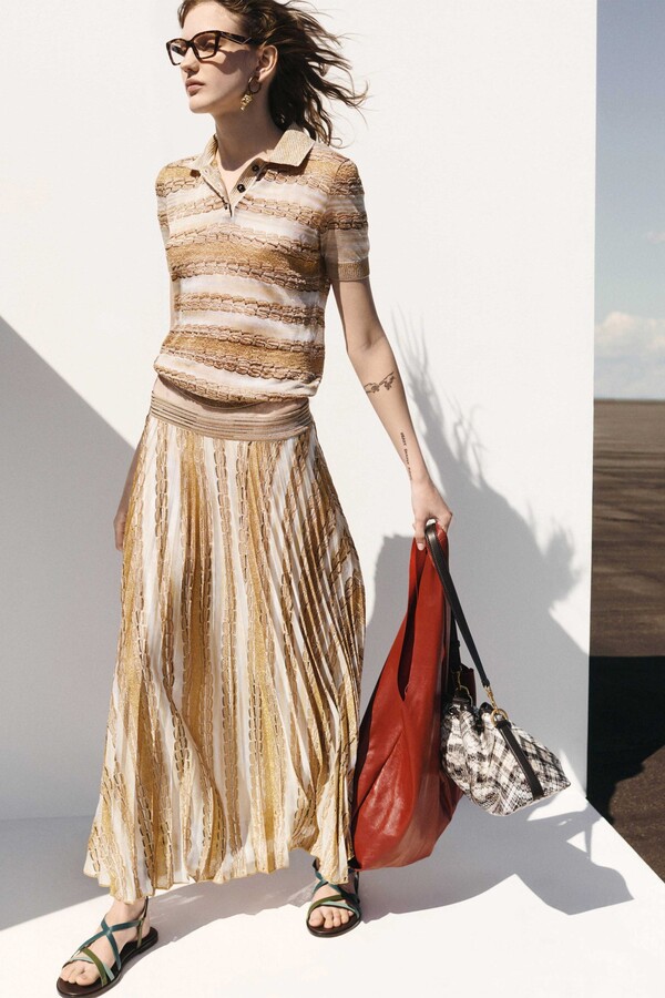 The collection includes versatile pieces such as polo shirts that transform into mini-dresses and soft three-piece suits, sensual halter dresses are adorned with micro-sequins, revealing intricate knitted stripes.