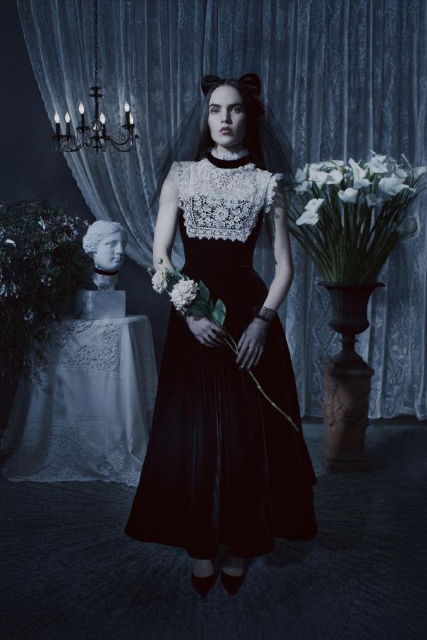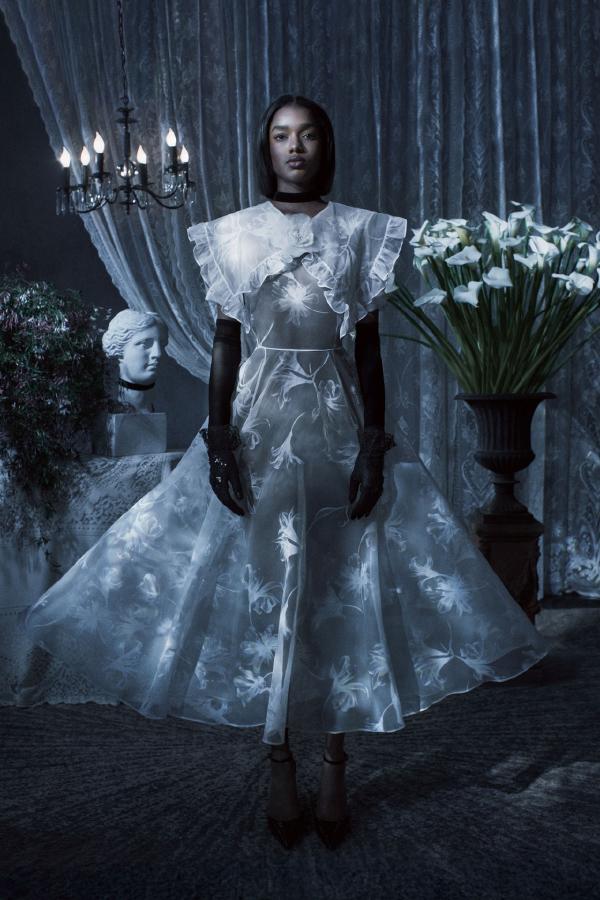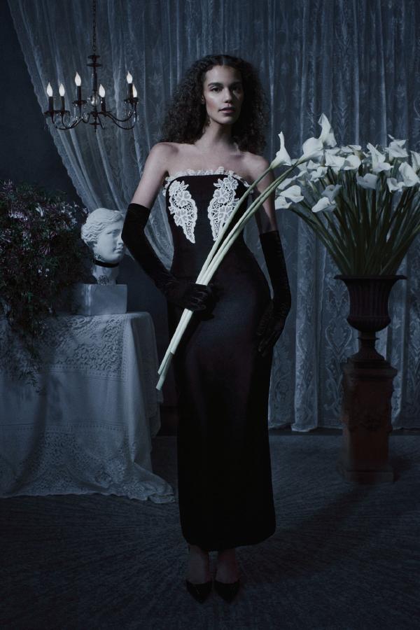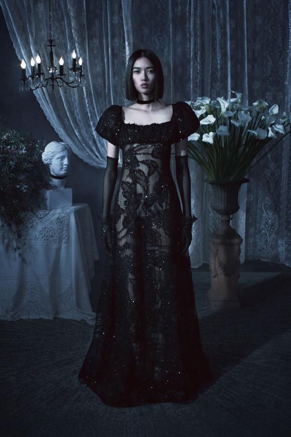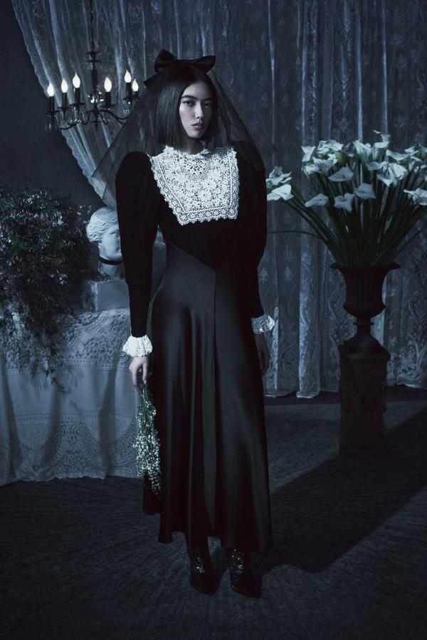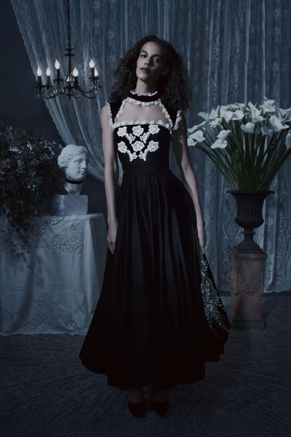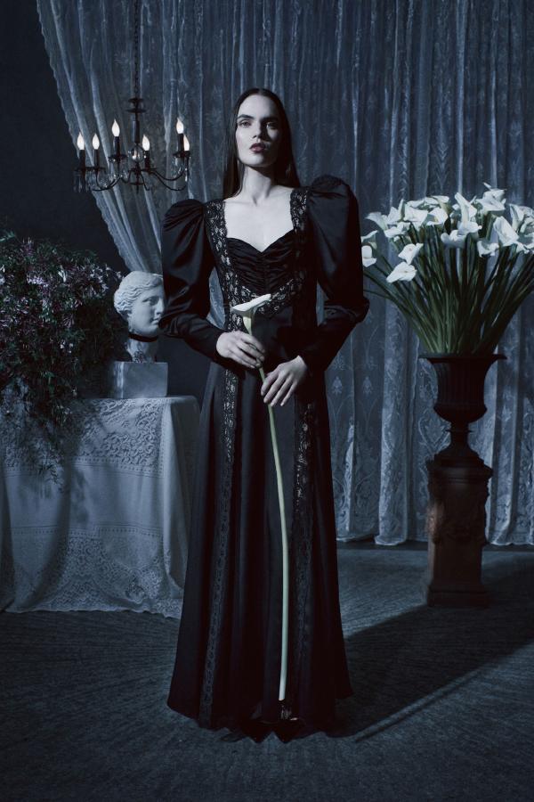 The collection culminates in a stunning gown featuring a lace-appliqued Victorian-style bodice, prominent princess sleeves, and a striking white-on-black floral inlay fabric, encapsulating the thematic essence of intricate detailing and evocative textile choices.