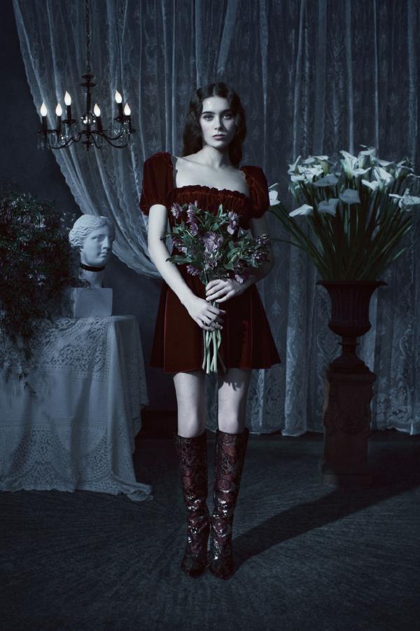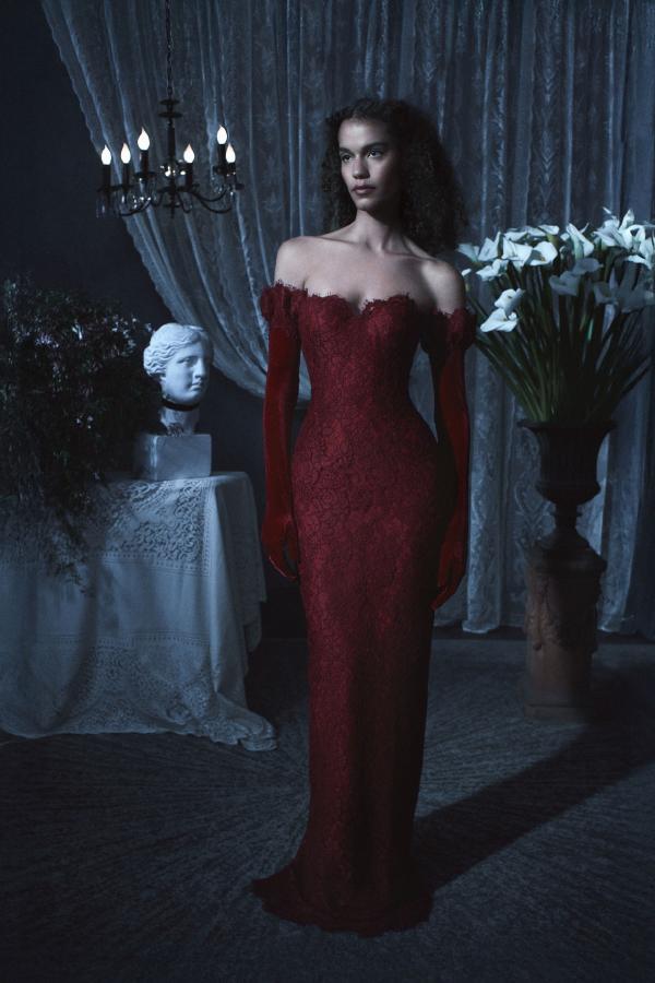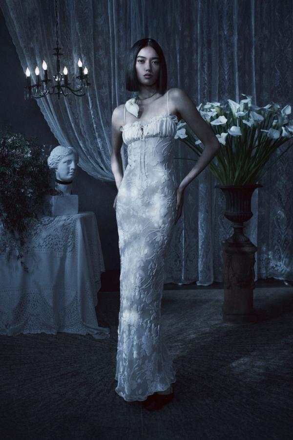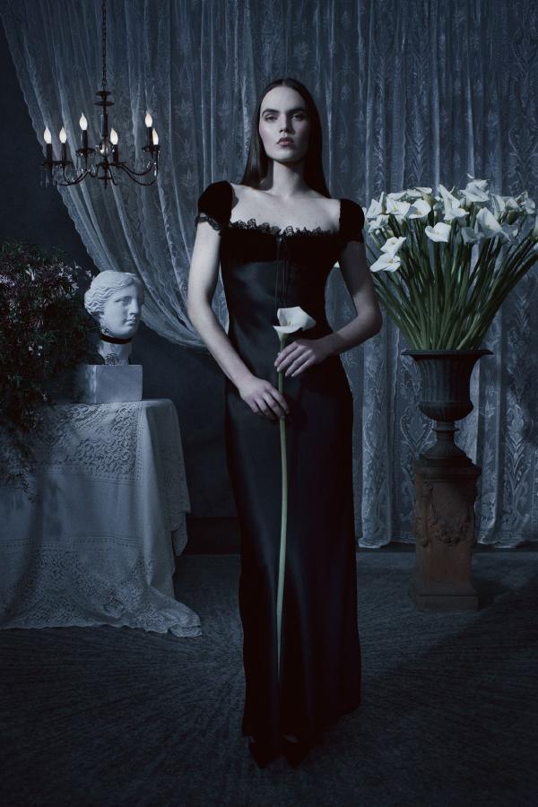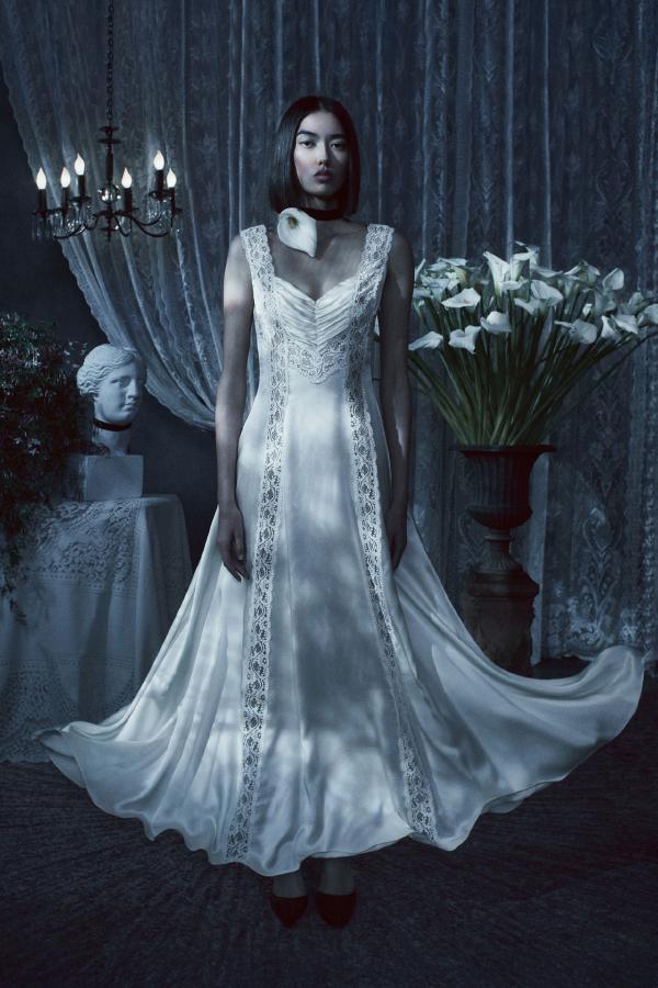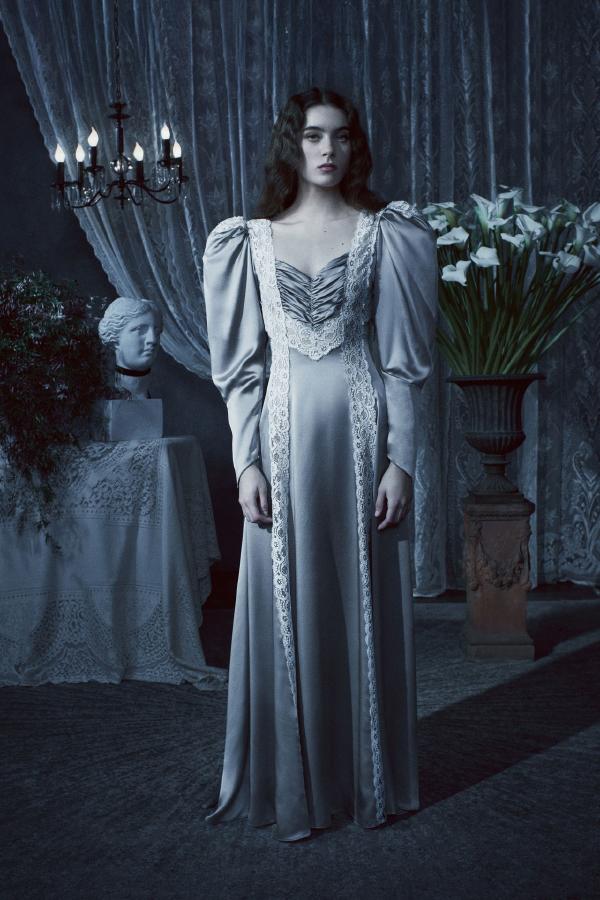 The collection features soft, voluminous charmeuse mutton sleeves and a gathered chiffon caftan with a ruffled hem that elegantly pools around the wearer. Alongside the initial gray, the collection introduces deep midnight crimson, unconventional mint green, and rich black, particularly in luxurious velvet. Subtle opulence is emphasized through white lace appliques on bodices and delicate trimming on necklines, with some silhouettes reflecting a monastic influence.