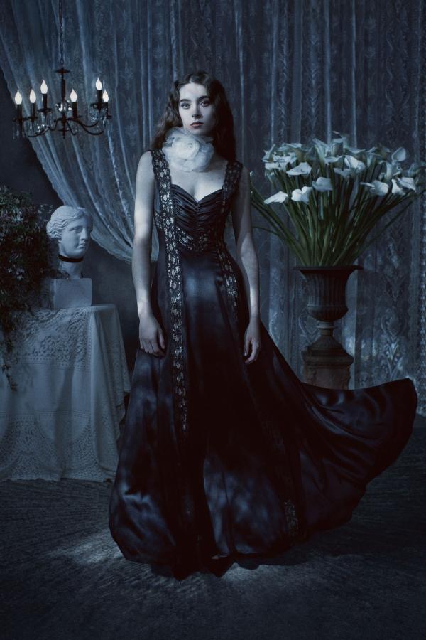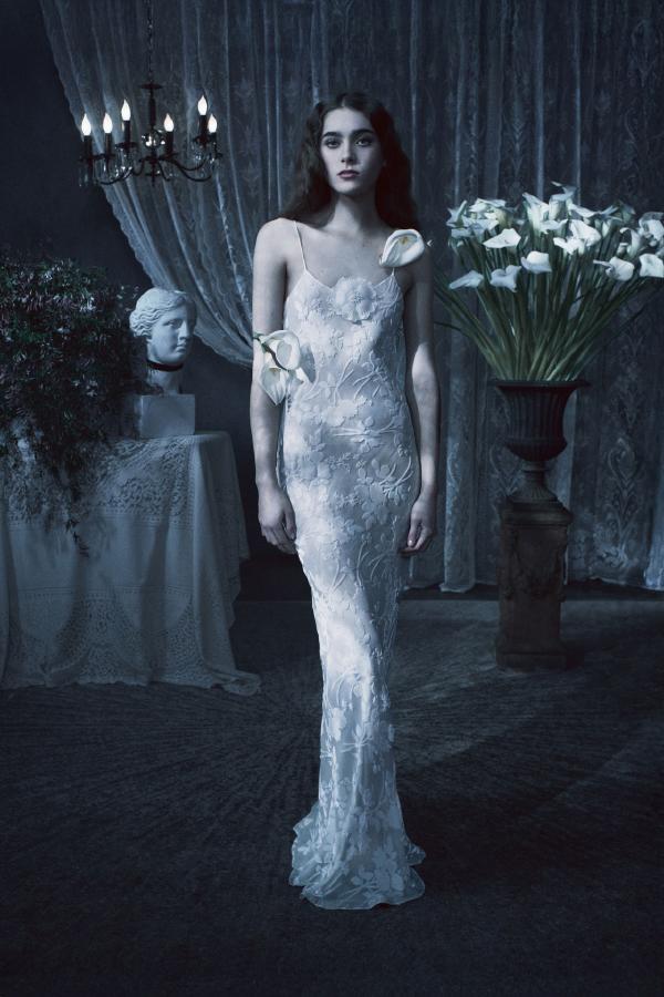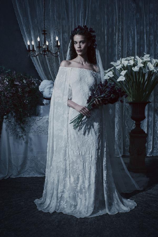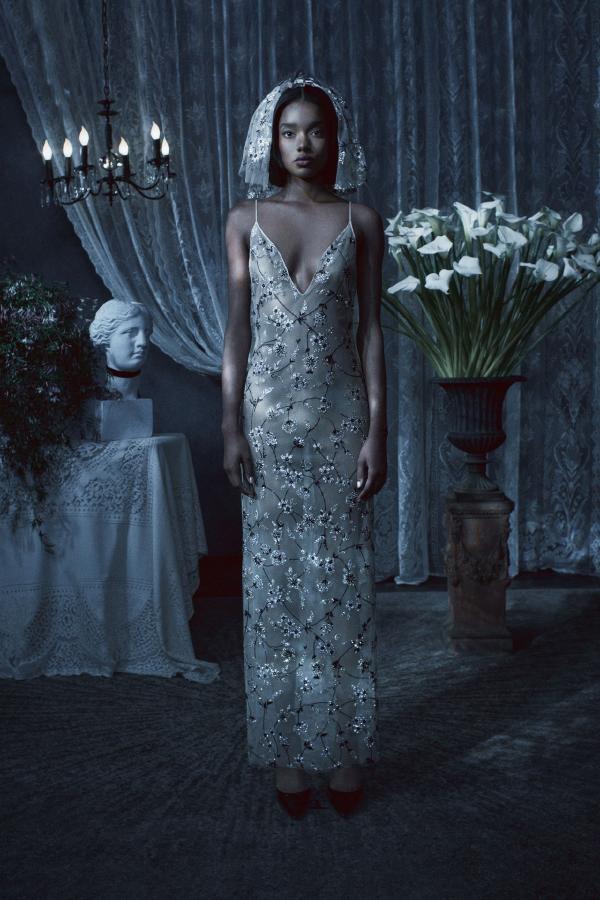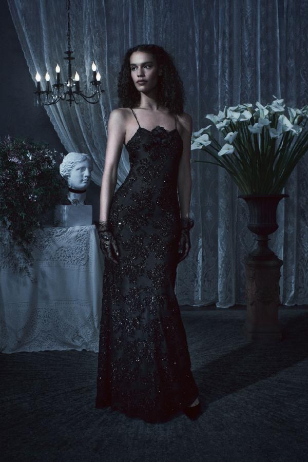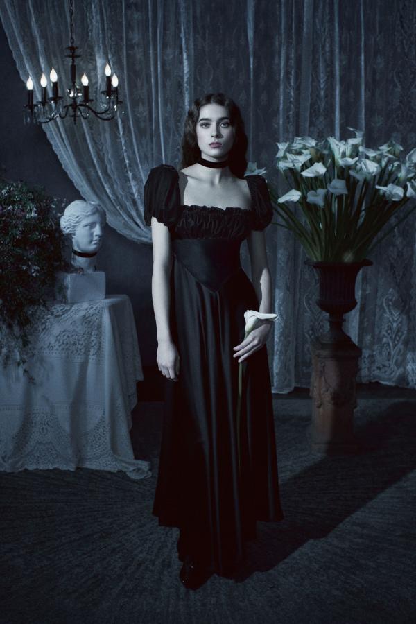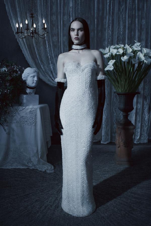 The collection features soft, voluminous charmeuse mutton sleeves and a gathered chiffon caftan with a ruffled hem that elegantly pools around the wearer. Alongside the initial gray, the collection introduces deep midnight crimson, unconventional mint green, and rich black, particularly in luxurious velvet. Subtle opulence is emphasized through white lace appliques on bodices and delicate trimming on necklines, with some silhouettes reflecting a monastic influence.